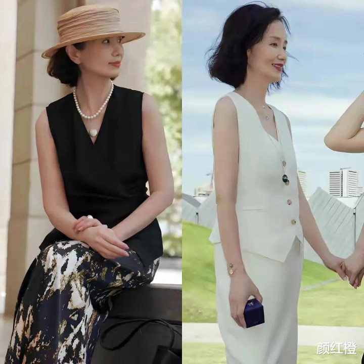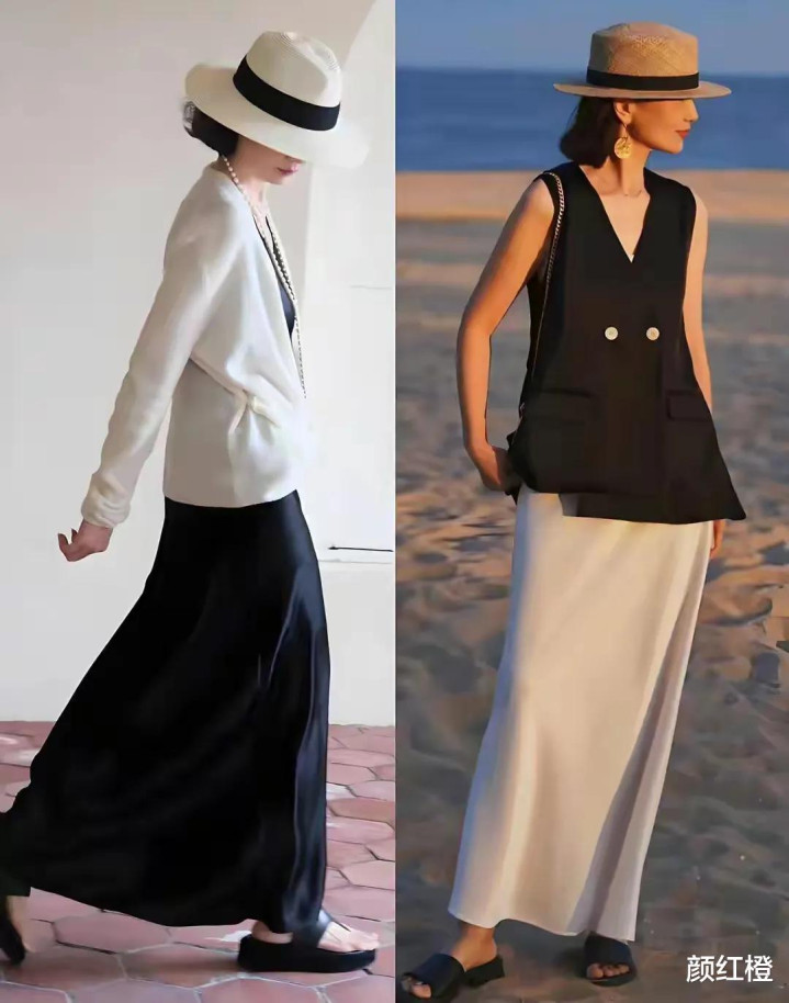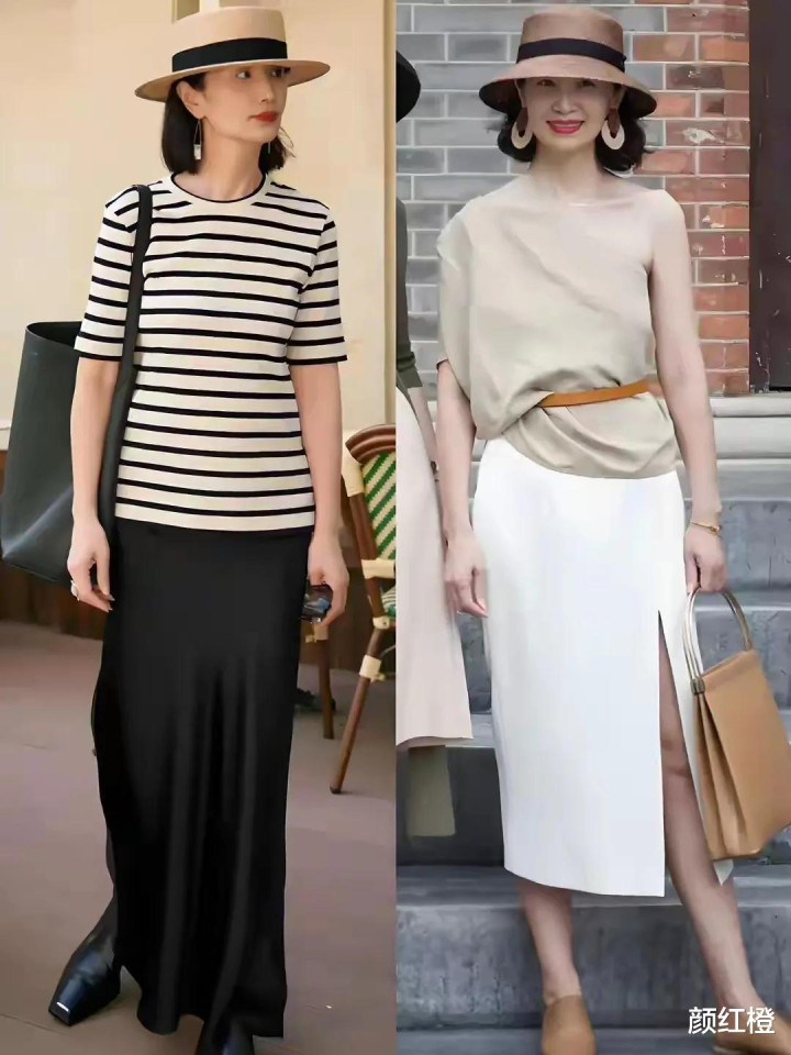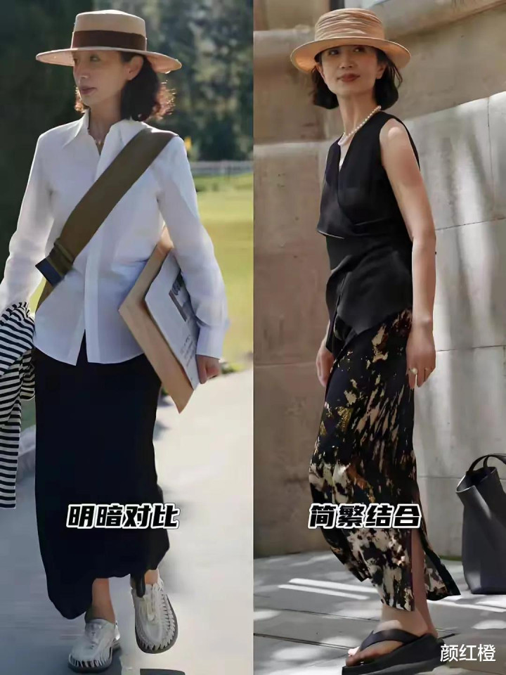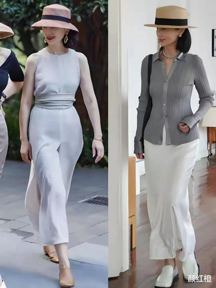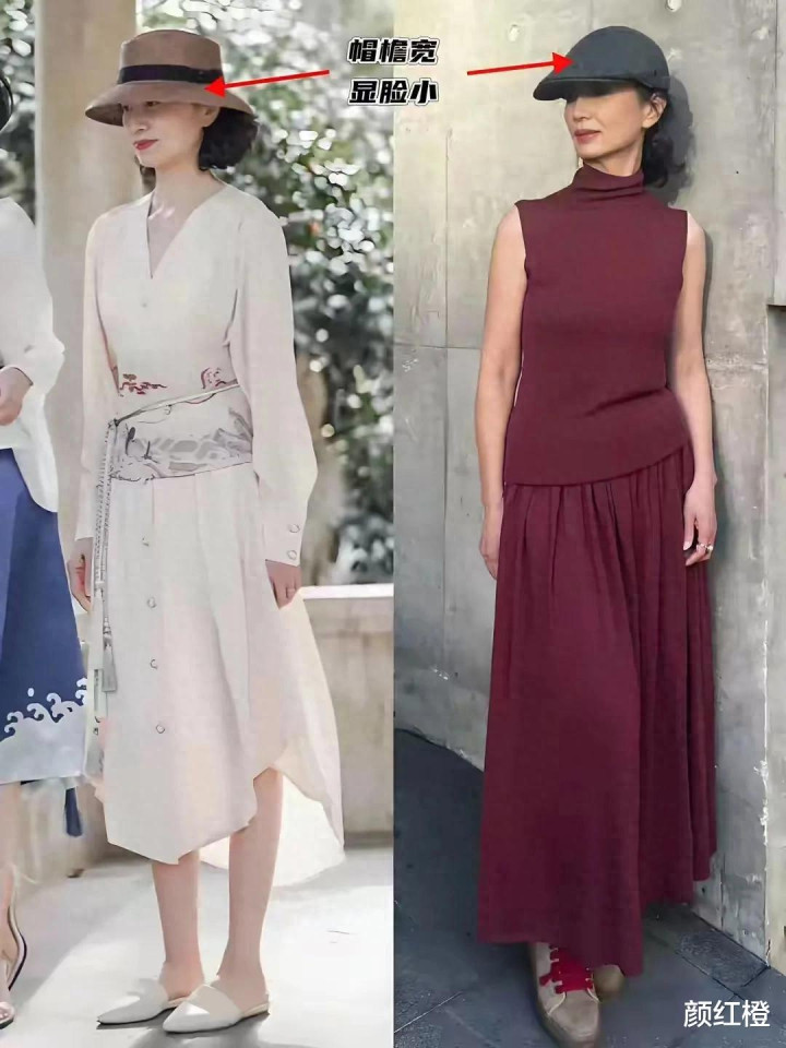 当然啦,最主要的还是人家也很会穿衣打扮,选择一件紫红色的无袖针织上衣搭配同色系的伞状半身裙,遮肉显瘦,头上戴的宽檐帽,显得小。包括左边这1套白色印花裙装,穿在身上高贵优雅。